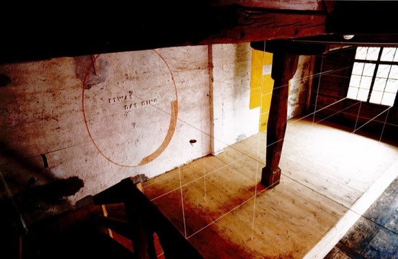 Heinz Völki zog mit weissen Schnüren ein Netz durch alle drei Geschosse und eröffnete damit neue Perspektiven und Ausschnitte auf das Vorhandene. Parallel dazu zeichnete er wie besessen, um die Kriegswirren in Bosnien zu überwinden. Was sich darin wieder spiegelte trotz viel tiefdunklem Graffit, viel Hoffnung und verheissungsvollen Glanz.