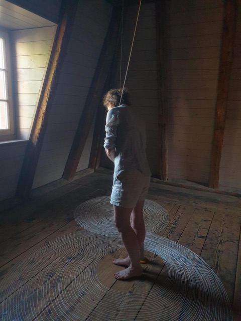 Gemeinsam mit Teilnehmenden aus der Arbeitsintegration entstand ein „Buch der Alphabete“, das die Vielfalt von Schrift und Ausdruck sichtbar macht. In der Remise webten die Künstlerinnen feine Fäden durch den Raum, die Kreise, Vorhänge und Zeichen formen. So entsteht ein dichtes Geflecht aus Linien, das Sprache als lebendigen Dialog und körperliches Erlebnis erfahrbar macht.