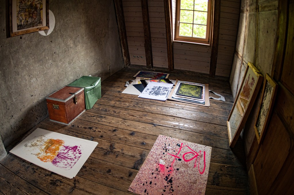 In der Remise wurde denn auch herzhaft experimentiert. Das dreigeschossige Haus wurde nicht nur bespielt sondern gewissermassen auch bevölkert mit «Götzen» oder «Ergötzbarem». Es wurde aber auch unkonventionell gedruckt, gemalt, gezeichnet, inszeniert und bis Ende Sommer präsentierte sich ein begehbares, buntes und überraschendes Universum. Ein Blickfang bildete das Treibhaus neben der Eingangstür. Ein üppiges Gewächshaus voller Tomaten- und anderen essbaren Stauden und Pflanzen tarnten eine Art Öko-Toilette und Manifest. Sägemehl und weitere Reststücke aus dem künstlerischen Prozess – so die Haltung und Behauptung – sollen einen geschlossenen Kreislauf bilden und einer sinnvollen Neunutzung zugeführt werden.